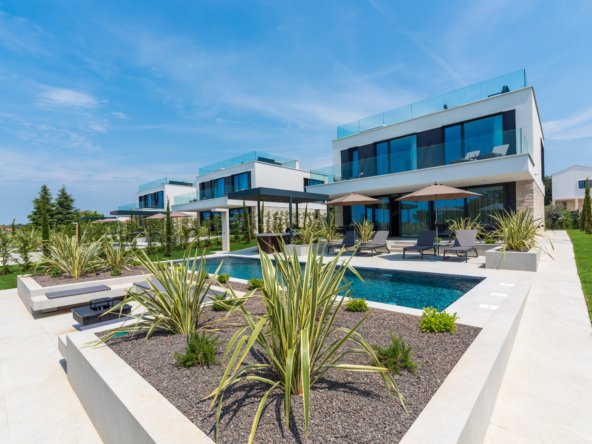 The villa is located on its own plot as part of a complex of villas with a total area of 3730 m2. It consists of 4 free-standing, fully furnished and equipped buildings with a view of the open sea (as the crow flies, about 2 kilometers).